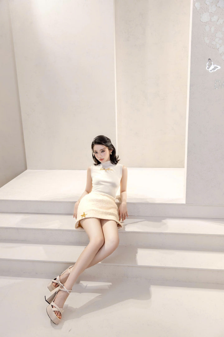 Chất liệu tweed mềm mại, điểm ánh nhẹ dưới nắng, mang đến chiều sâu thị giác vừa ấm áp vừa tinh tế. Chiếc áo khoác có độ phồng nhẹ ở tay, giúp tôn dáng vai và tạo hiệu ứng cân bằng hình thể, trong khi chân váy ôm gọn gàng tôn lên đôi chân thon dài – một tỉ lệ hài hòa chuẩn mực mà vẫn đầy nữ tính.