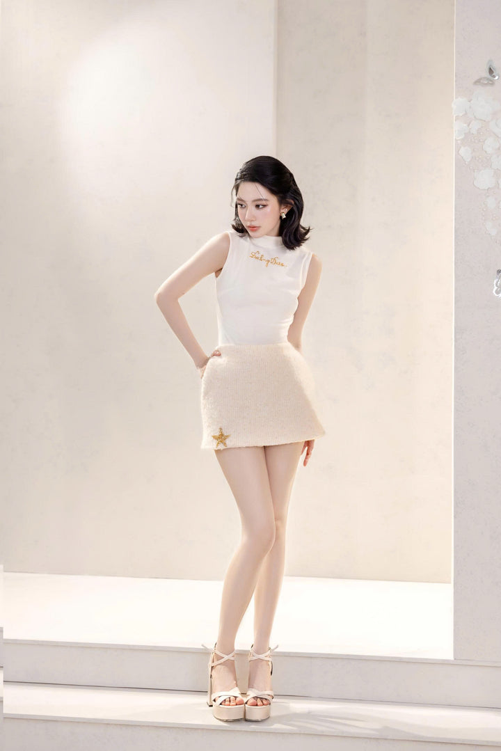 Bộ set tweed gồm áo khoác bomber phom suông và chân váy mini được xử lý tinh xảo, tạo nên sự hòa quyện hoàn hảo giữa nét trẻ trung và sự thanh lịch vượt thời gian.