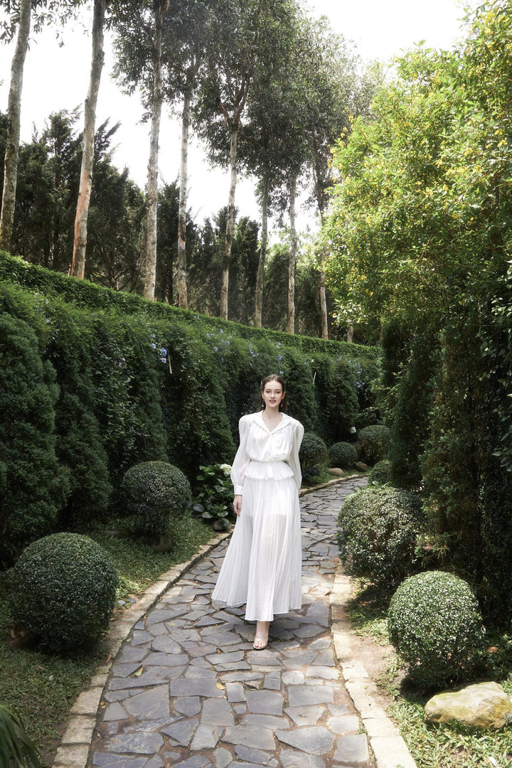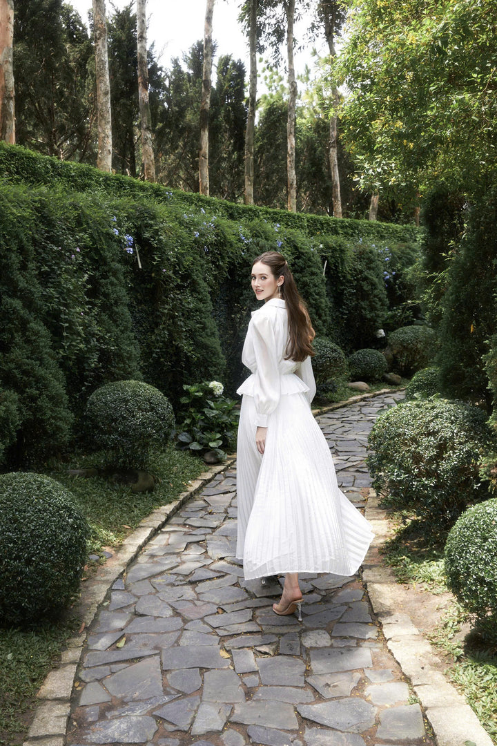 Sự tinh khiết được khắc hoạ qua chiếc đầm trắng dài tay với phần cổ sơ mi thanh lịch, tay phồng mềm mại và eo bo nhẹ nhàng.