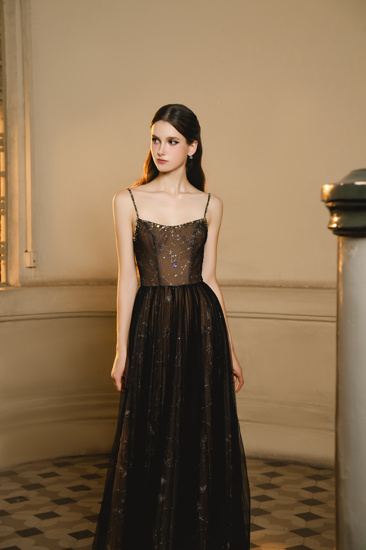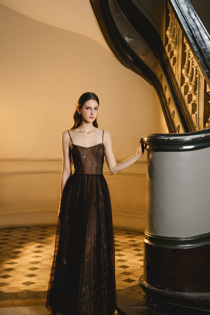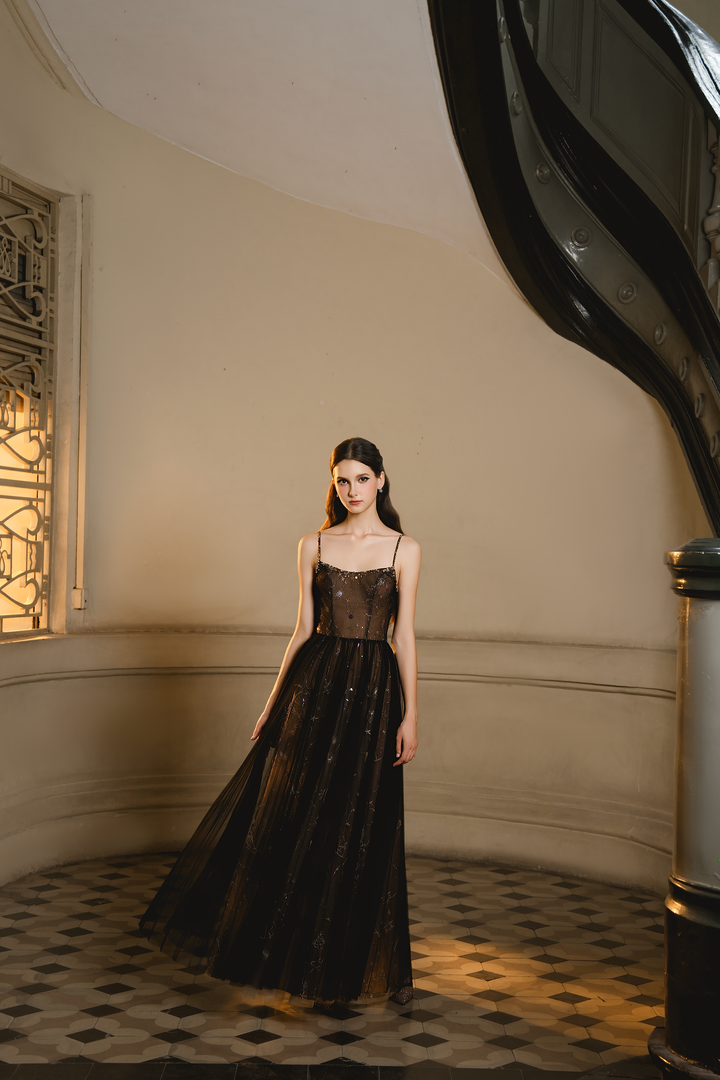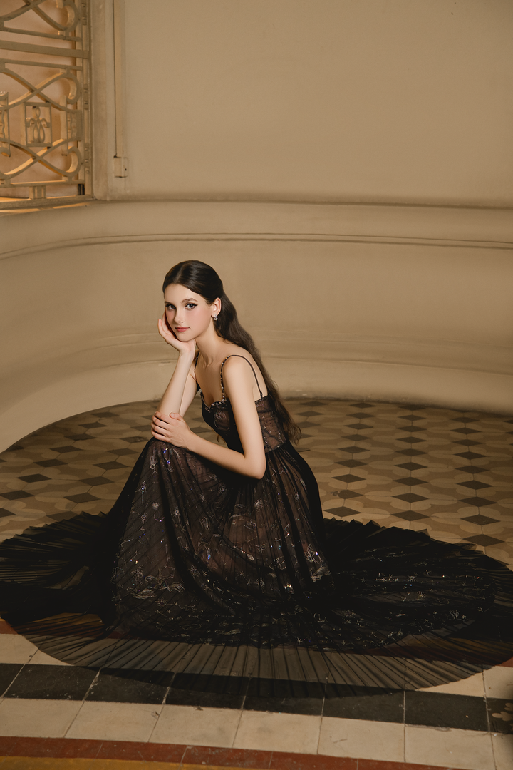 Toàn bộ thân váy được phủ lớp voan đen mỏng, điểm xuyết chi tiết sequin lấp lánh như bầu trời sao. Dáng váy dài buông thẳng, mang lại vẻ đẹp kiêu kỳ và huyền bí.