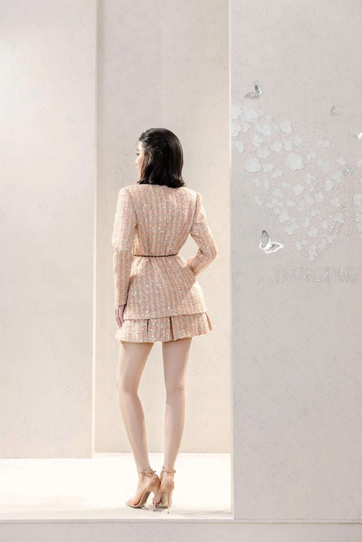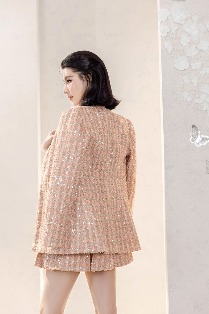 Chất liệu tweed óng ánh phản chiếu ánh sáng, làm nổi bật vẻ mềm mại và rạng rỡ của người mặc.