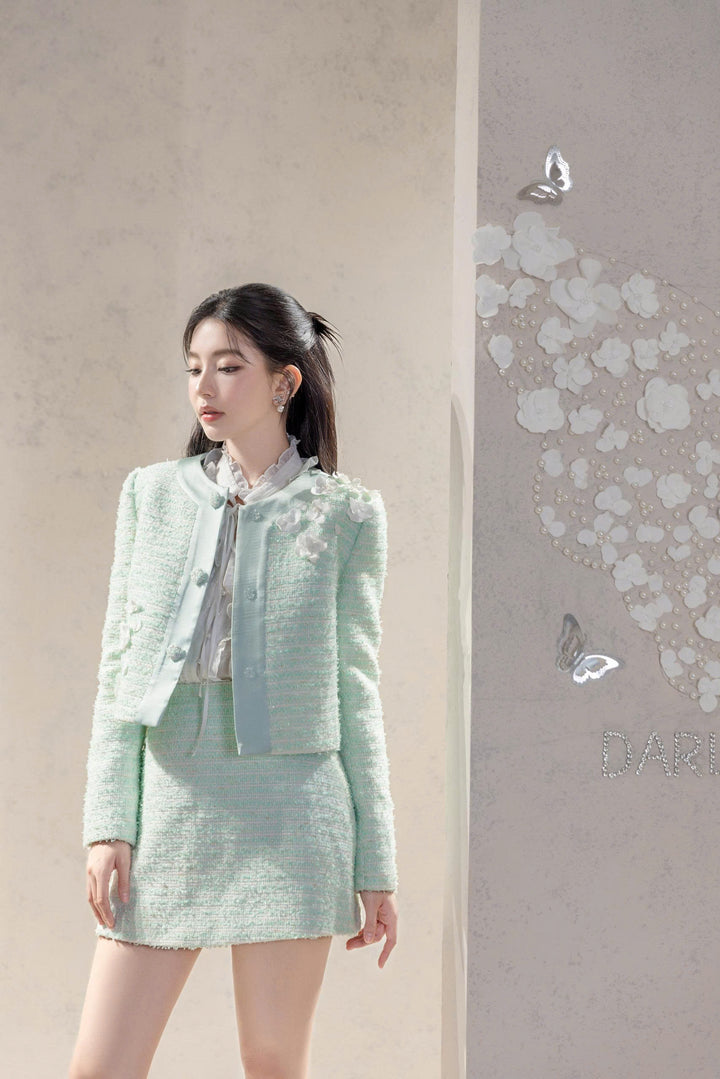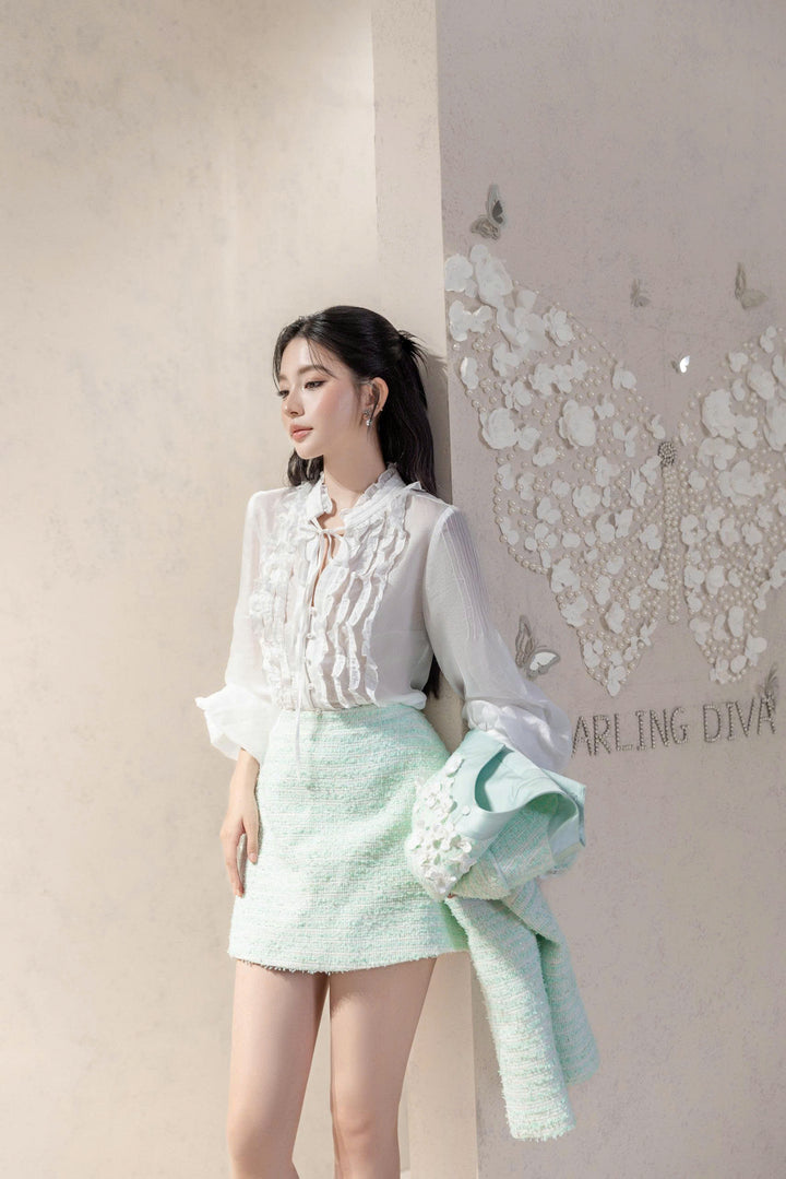 Thiết kế gồm áo khoác tweed xanh mint phối cùng sơ mi cổ bèo, mang lại vẻ đẹp thanh lịch pha chút cổ điển.