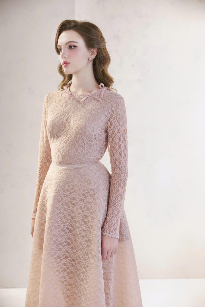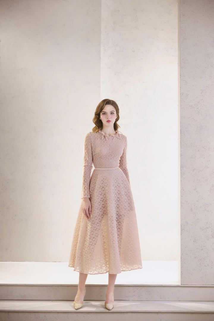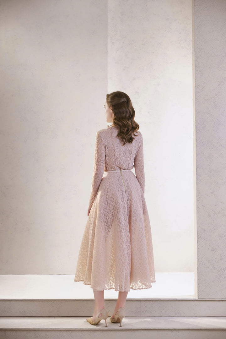 Thiết kế váy ren hồng pastel mang đến vẻ đẹp thanh lịch và nhẹ nhàng, với phần cổ áo sơ mi tinh tế cùng tay dài ôm gọn tạo nên phong thái kín đáo nhưng vẫn đầy cuốn hút.