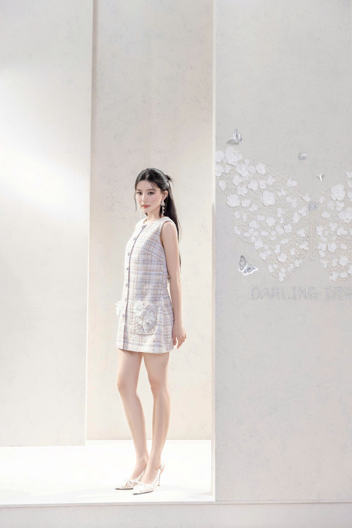 Chiếc đầm tweed trắng mang gam màu dịu nhẹ, điểm xuyết chi tiết hoa 3D ở phần túi tạo nên vẻ ngoài vừa nữ tính vừa tinh tế.