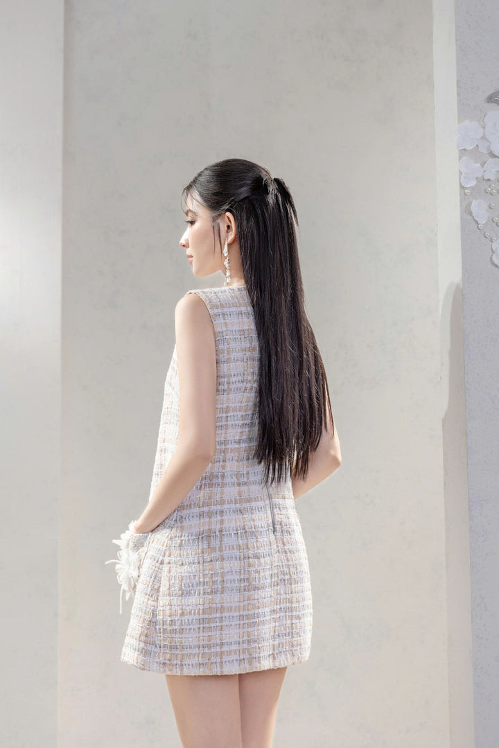 SKYLAR DRESS - Đầm Tweed Trắng Phối Hoa 3D Túi Trước Nhã Nhặn
